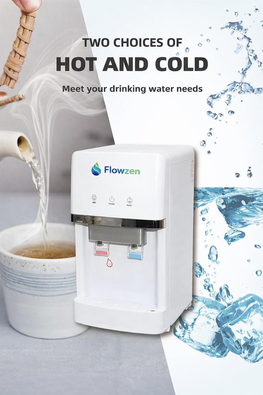 Flowzen Dispenser RO merupakan Dispenser Air Minum (Panas, Dingin dan Fresh) dilengkapi Sytem RO tercanggih saat ini sehingga mampu mengubah air kran dirumah menajadi air minum secara hygienis dengan kualitas 10x lebih murni dari air galonan biasa.
